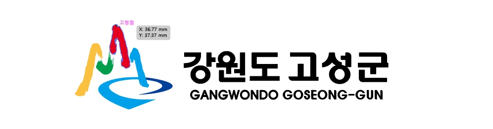 색상의 의미로는 금강산의 형태를 이루는 황색, 녹색, 금적색, 하늘색은 봄, 여름, 가을, 겨울 화려하게 변하는 금강산의 4계절을 상징하며 타원을 구성하는 군청색과 하늘색은 청정한 바다와 호수를 상징한다고합니다. 심볼마크의 재생은 재생자료를 제필 촬영하여 확대, 축소하는 것을 원칙으로 하나 대형으로 제작할 경우에는 그리드 시스템을 적용합니다.