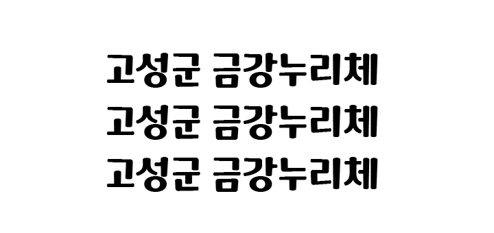 듬직한 금강의 산새를 느낄 수 있는 폰트 같다는 생각이 듭니다. 고딕체면서 끝이 부드러워 유연함이 있어보이지만 굵기의 장단이 있어 리듬감이 있습니다. 네모틀 구조에서 활발하고 다양한 느낌을 주었다고 하는데 보는 사람의 시선에서도 잘 느껴지는 폰트인 것 같습니다. 굵기는 다양하지 않고 단일로 이루어져 있습니다.