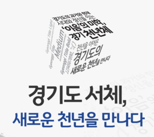 경기도 서체인 경기천년체는 경기도의 역사적, 지리적, 문화적, 사회적 특성을 시각화 함으로써 경기도의 정체성을 강화하기위한 목적으로 제작되었다고 합니다. '이음'이라는 컨셉을 하고 있으며 자음과 모음의 유연한 연결, 꼭지 모양과 받침의 마무리 상승 등 디자인의 요소가 반영되어 있습니다. 경기천년체는 2가지로 제작되어, '경기천년제목', '경기천년바탕'으로 구분되며 제목체는 4종으로 제작되었고, 바탕체는 2종으로 제작되었습니다. 상업용으로 사용하여도 저작권의 문제가 없어서 많이 사용하는 폰트 중에 하나입니다.