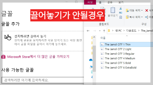 제어판 > 글꼴에 아래와 같이 '설치하려면 끌어서 놓기'라고 안내를 해주고 있습니다. 그런데 아무리 파일을 가져다 놓다고 적용이 안된다고 표시가 나온다면 다른 방법으로 설치를 해야 합니다. 끌어서 놓기가 되지 않는다면, 마우스 우클릭을 이용한 방법을 할 수 있습니다. 아래에 자세한 방법을 첨부하였으니 확인하시기 바랍니다.