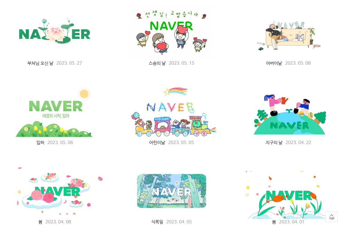 여러 기념일을 역동적으로 디자인해서 해마다 다르게 디자인해서 보여주고 있어요. 그냥 지나갈 날일때도, 아 오늘이 중복이구, 오늘이 어린이 날이구나. 오늘이 입추구나!를 단번에 알아 차릴 수 있게 해줍니다. 디자인 또한 얼마나 신박한지 저 작은 NAVER 글자안에 응축되는 디자인도 너무 재밌더군요. 네이버에서는 폰트 부분에서도 많은 기여를 해주고 있습니다.