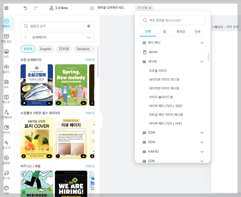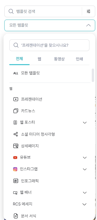 디자인플랫폼 미리캔버스를 사용하기에 아주 유용한 부분은 원하는 형태의 크기의 작업창을 선택하면 자동으로 세팅되어 이용할 수 있다는 것입니다.