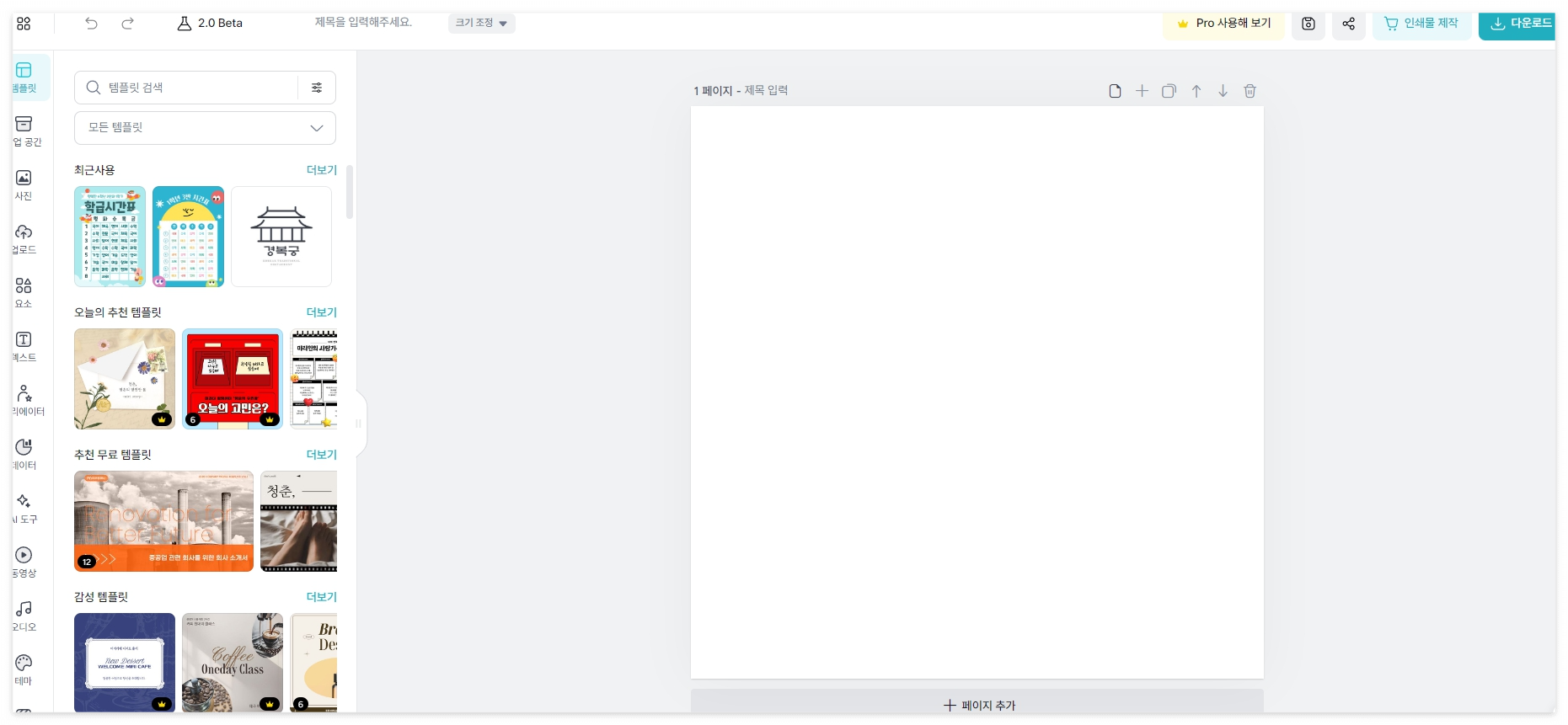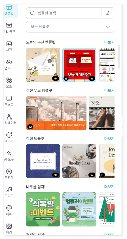 오늘의 추천 템플릿, 추천 무료 템플릿, 감성 템플릿 등 다양한 템플릿을 볼 수 있습니다.