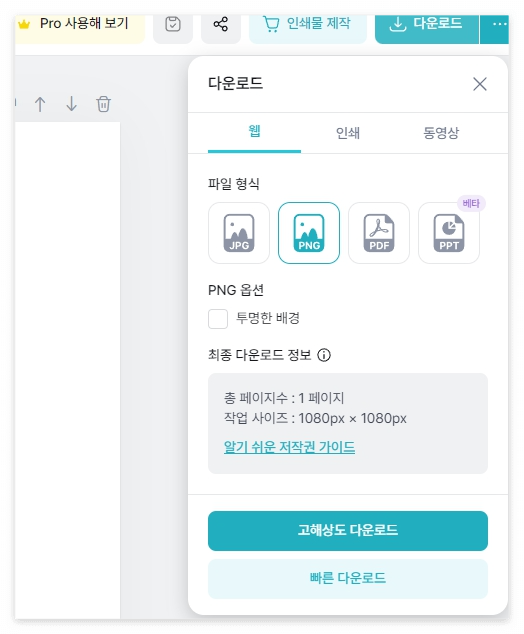 5. 우측 상단에 인쇄물을 저장할 수 있는 '다운로드' 버튼을 누르면 아래와 같은 설명이 나옵니다. 웹, 인쇄, 동영상 형태의 저장형식을 선택하여 저장하면 쉽게 저장할 수 있습니다. ('고해상도 다운로드'는 유료버전)