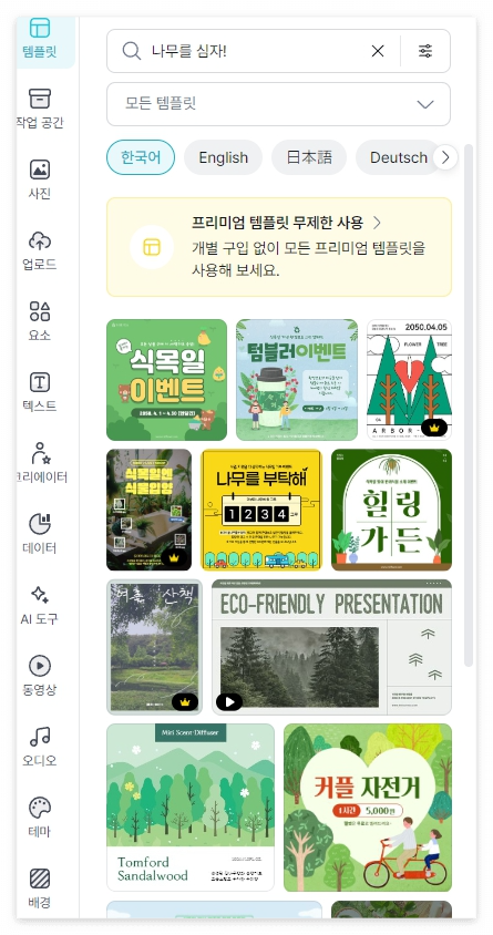 3. 좌측에 보면, 여러 툴을 사용할 수 있는데요. 완성되어 있는 템플릿을 사용할 수 있습니다.