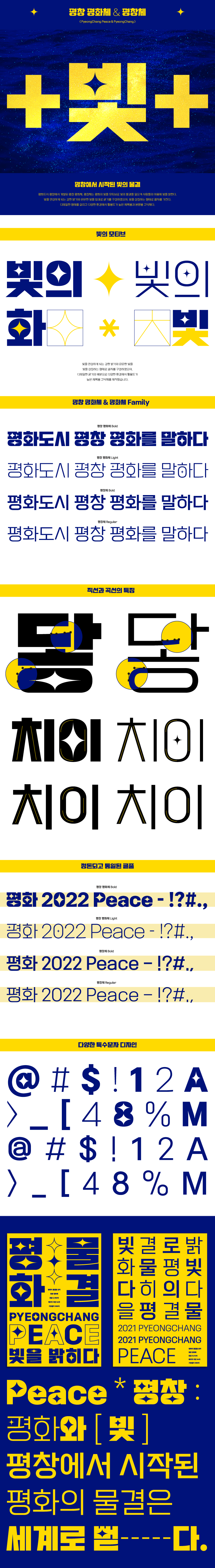 무료폰트 평창평화체와 평창체가 만들어진 모티브는 '2018 평창동계올림픽=세계인의 평화=확산'을 상징하도록 하여 '빛'으로 표현된 폰트입니다. 평창군의 서체개발은 한국디자인진흥원이 개발을 진행해 왔으며, (주)윤디자인그룹이 참여했습니다.
