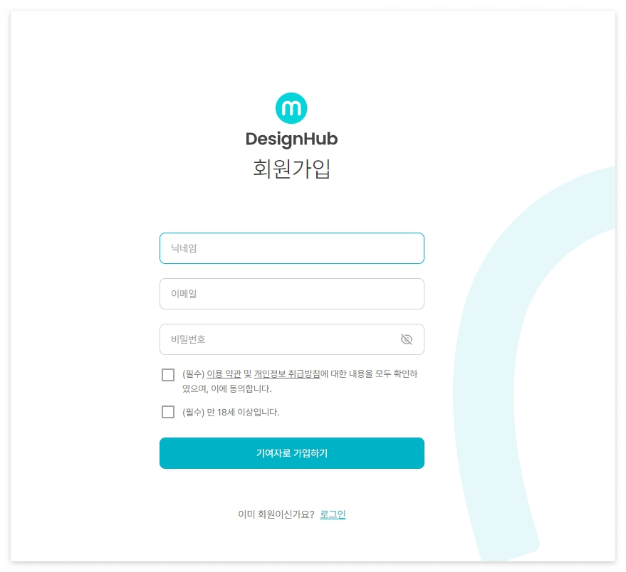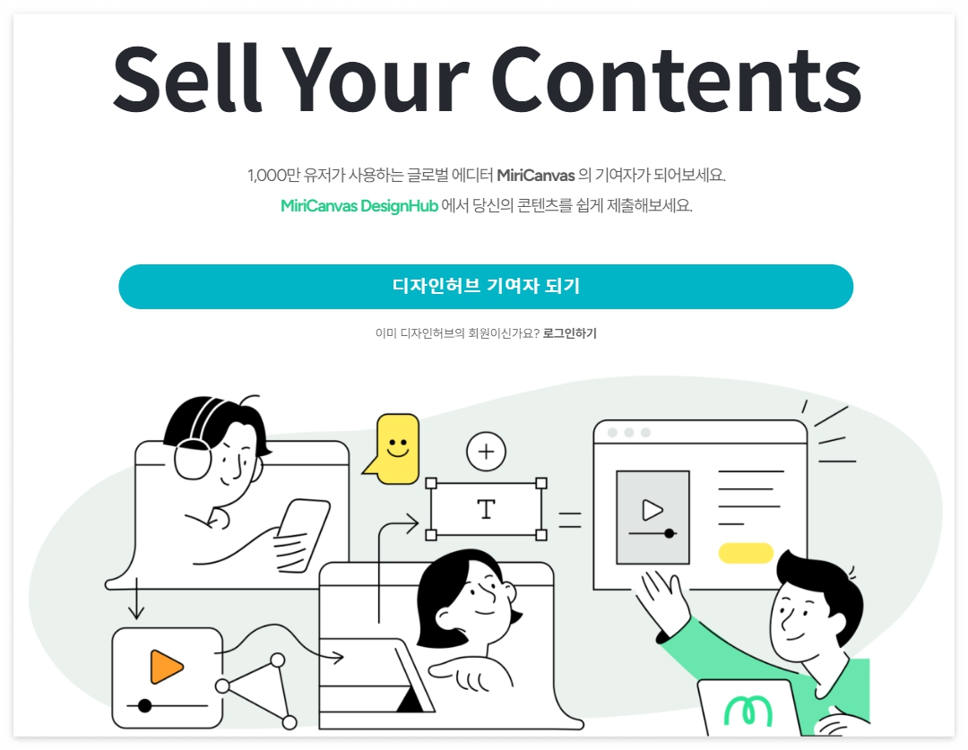 이 미리캔버스 디자인허브는 접속하기 전에 '기여자'로서 가입을 해야 합니다.