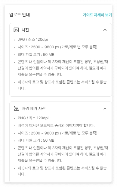 좌측 툴을 보면 이미지를 업로드하고 진행상황을 확인할 수 있는 내용이며, 우측에는 요소들 별 업로드 관련 안내사항을 확인할 수 있습니다.