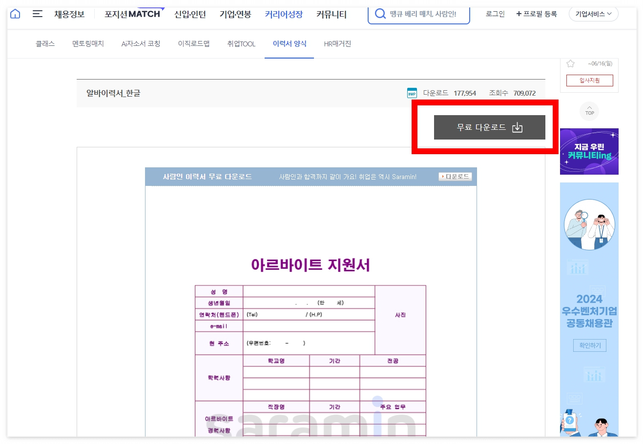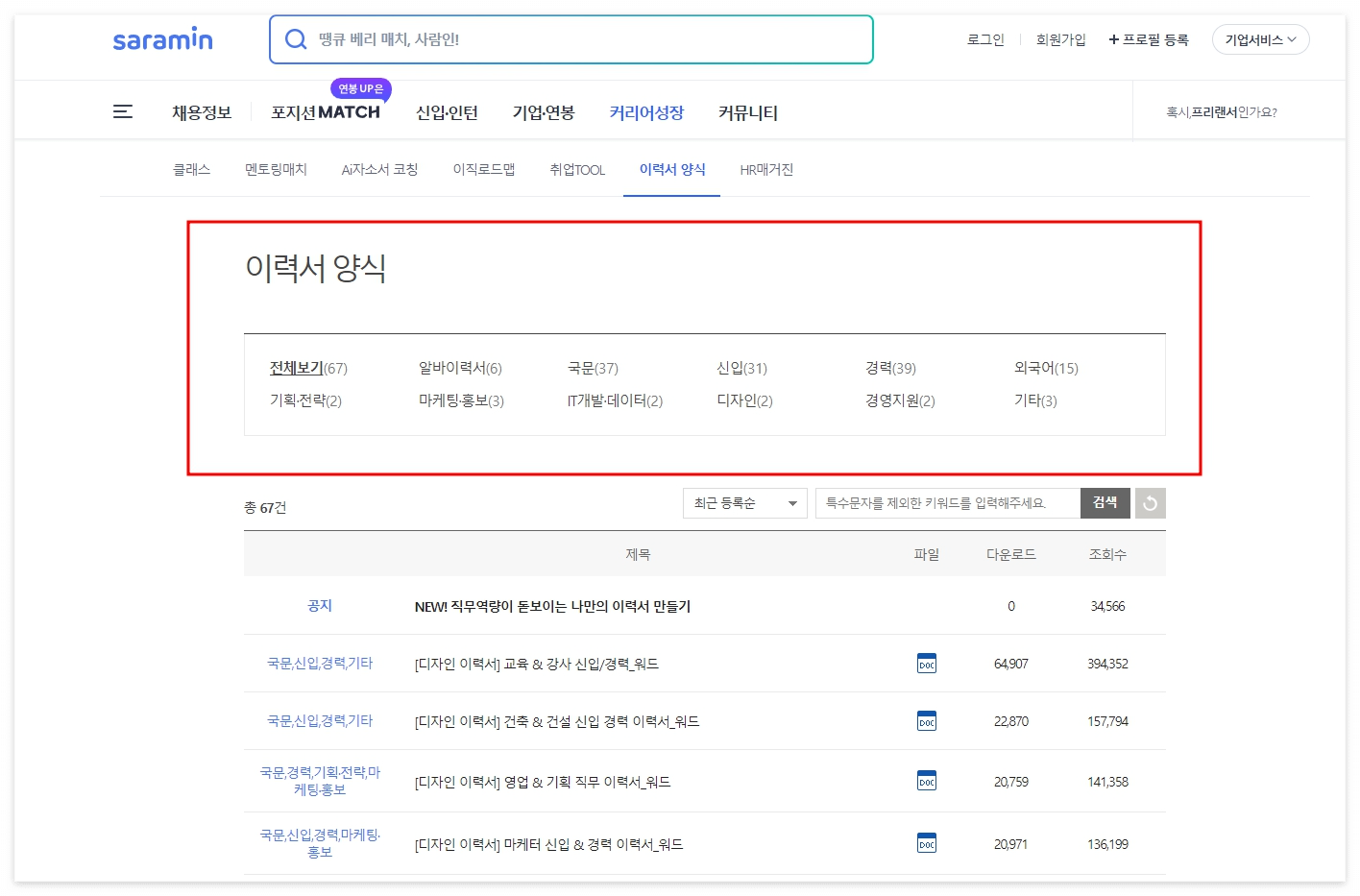 사람인 홈페이지 메인 > 커리어성장 > 이력서 양식