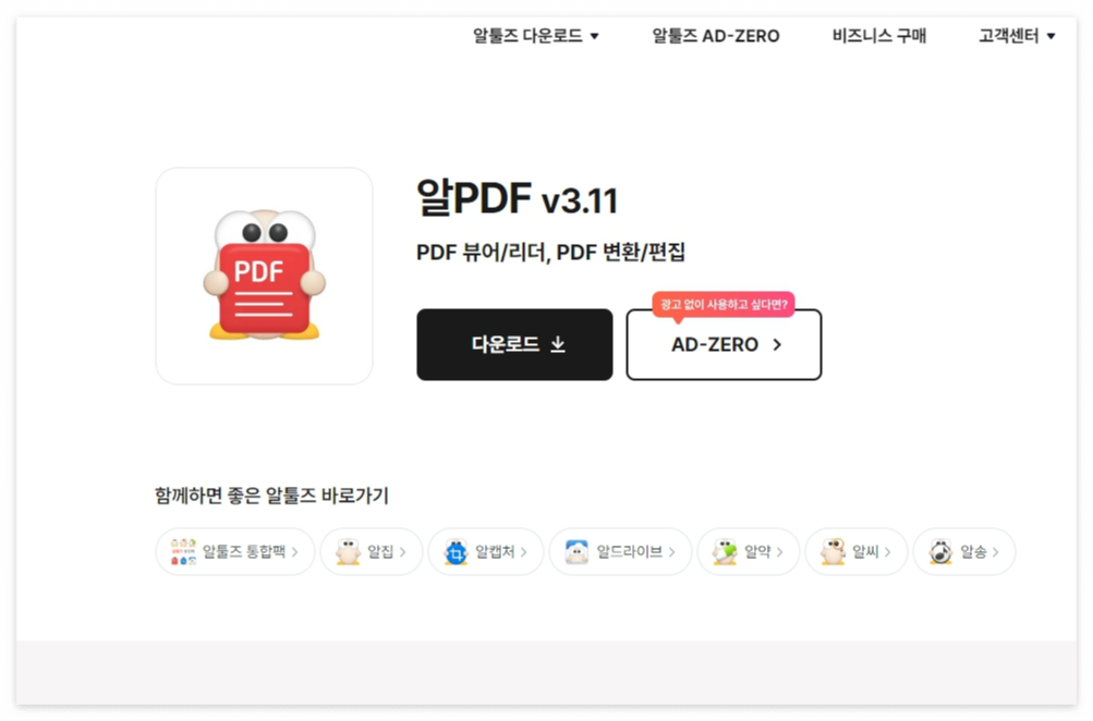 알 PDF를 다운로드하기 위해서 검색을 했는데, 공식홈페이지는 찾기 어렵고 개인 블로그나 사이트로 연결되는 경우가 많았어요. 그래서 공식홈페이지를 찾았습니다. 광고 없이 사용하기 위해서는 유료버전으로 이용할 수 있습니다