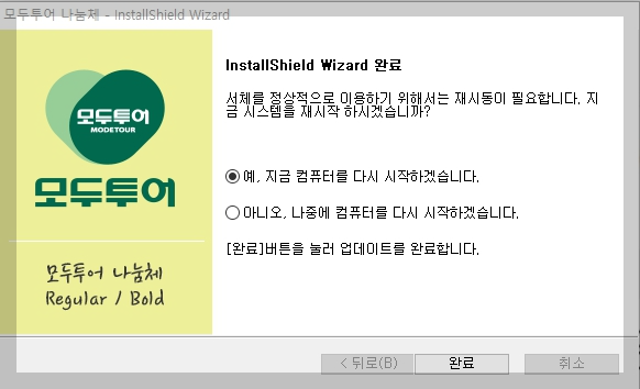 압축파일을 열면, 다른 폰트파일과 다르게도 아래와 같은 설치프로그램이 등장합니다. 더블클릭하여 순서대로 설치하시면 됩니다. 마지막에 [다시 시작] 혹은 [나중에 다시 시작] 중 원하시는 선택을 하시어 진행하여 사용할 수 있습니다.