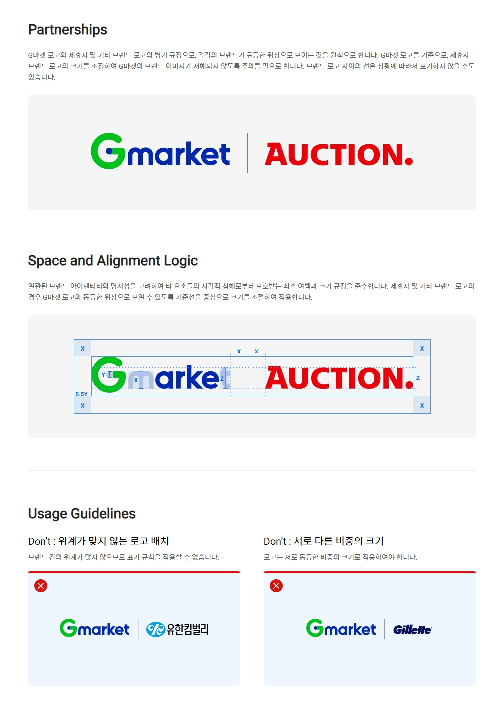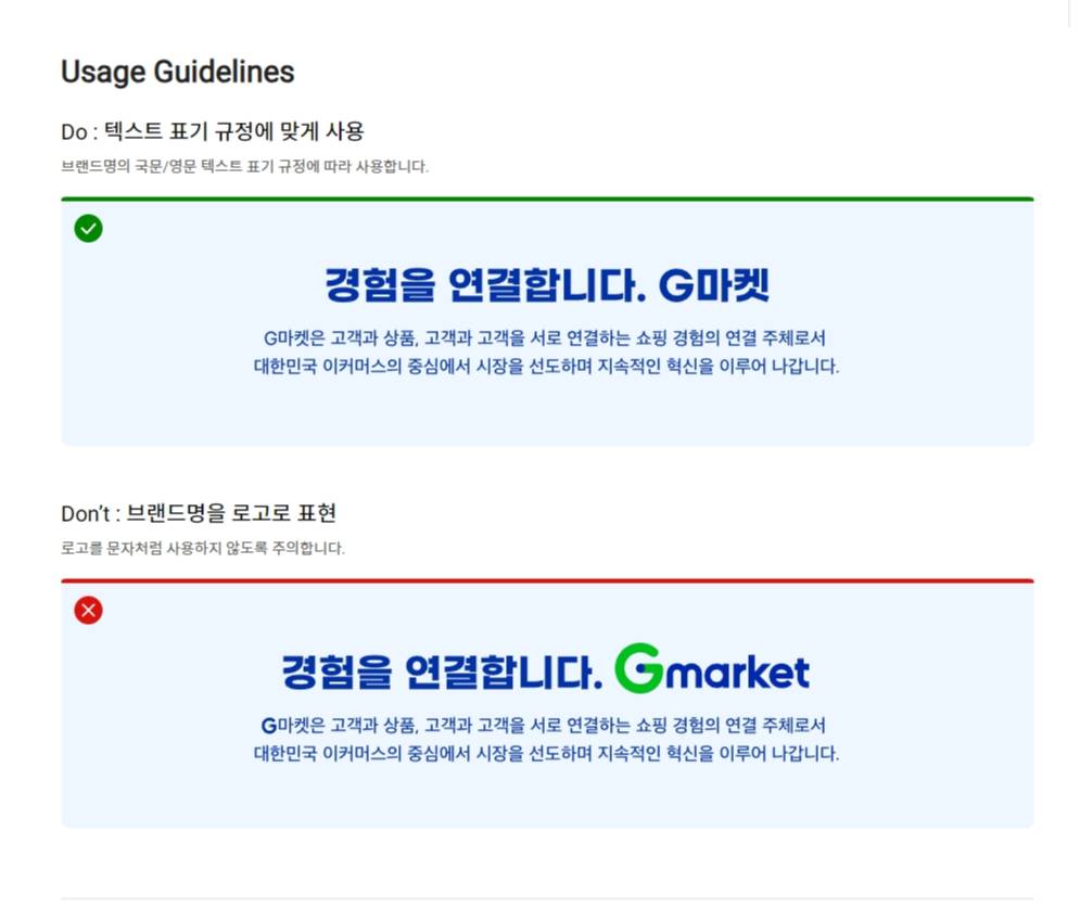 G마켓의 로고는 Connection, Center, Forward, Variety 라는 브랜드의 가치를 시각 언어로 표현한다고 합니다. 로고는 G마켓 브랜드를 대표하는 핵심 요소이므로 왜곡 및 변형에 유의하고 규정을 숙지하여