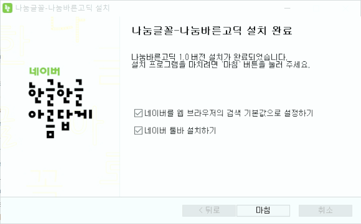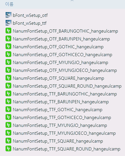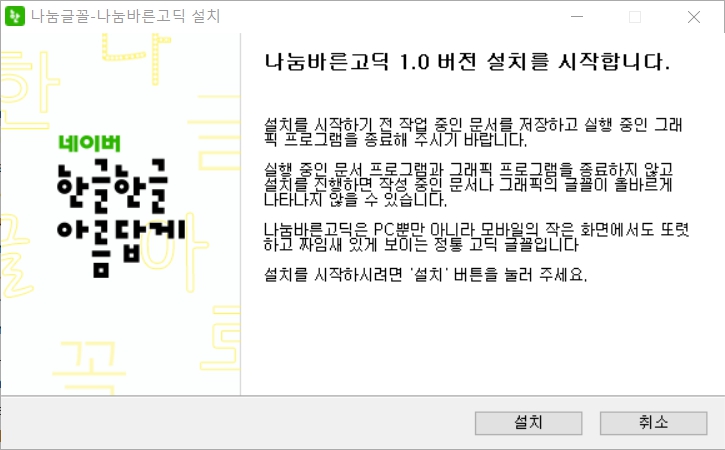 끌어넣는 방법과 달리 아래처럼 설치 프로그램으로 구성된 폰트는 더블클릭하여 설치를 하여 사용할 수 있습니다. 과정은 복잡하지 않고 단순하여, 설치를 위한 윈도안내창과 마침을 위한 윈도안내창을 확인할 수 있습니다. 대체적으로 네이버에서 제공하는 무료폰트(나눔 고딕, 나눔체, 나눔 명조체 등)가 이렇게 설치가 됩니다.