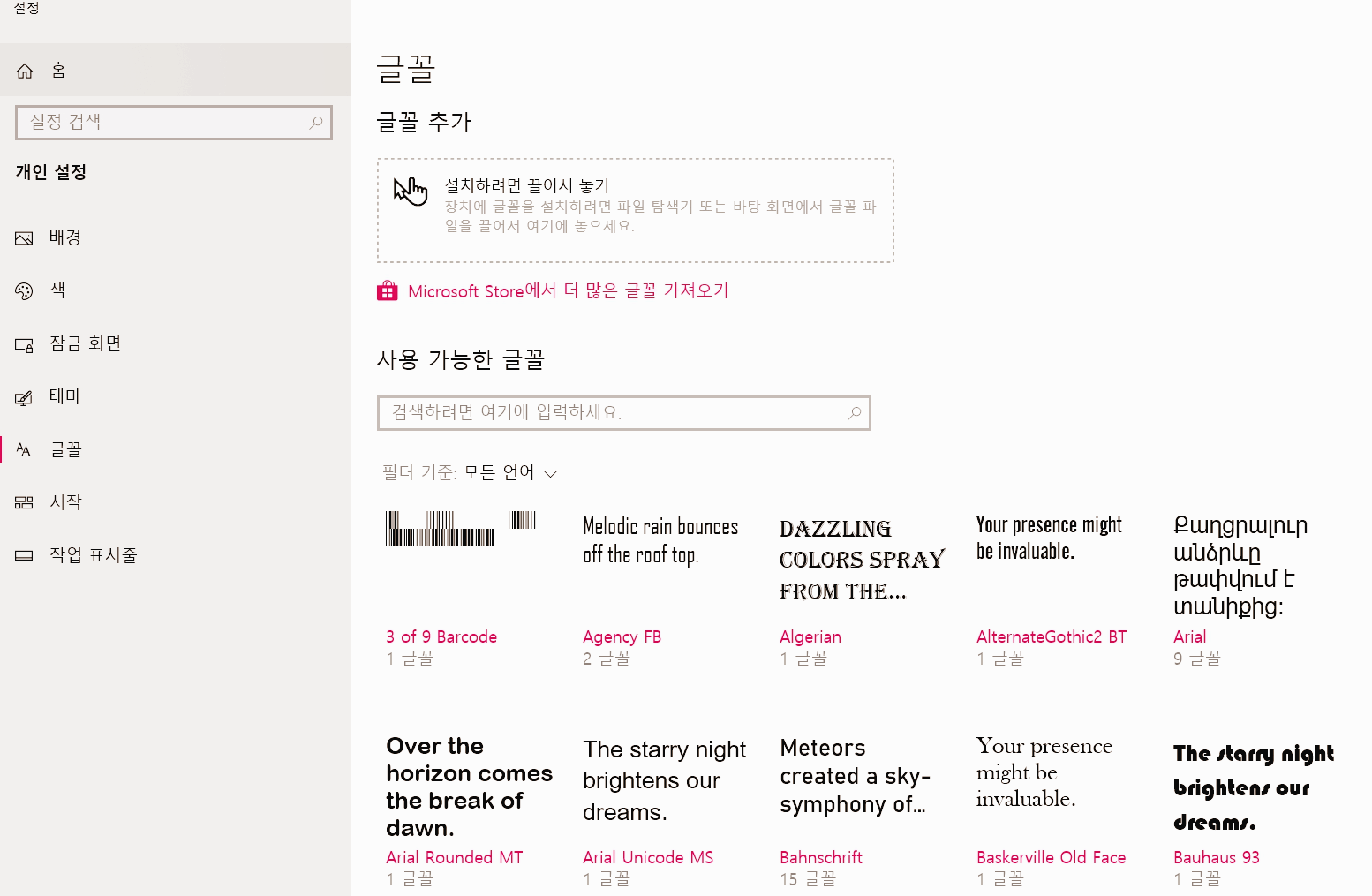 설정 또는 제어판에서 글꼴이나 폰트, font를 찾을 수 있습니다. 사용을 원하는 폰트를 손가락 모양이 있는 자리로 끌어 가지고 오면 설치됩니다.
