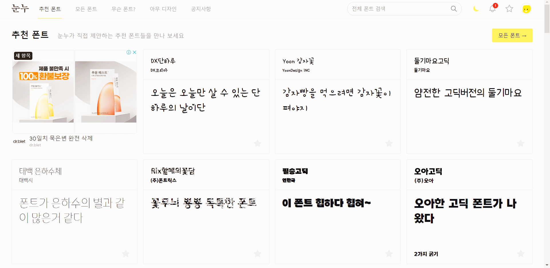 눈누홈페이지는 상업적으로 허용이 가능한 폰트를 모아서 보여주는 사이트입니다. 모든 폰트를 상업적으로 사용할 수 있는 것이 아니어서 눈누에서 구분하여 업로드하여 폰트 파일을 제공해주고 있습니다.