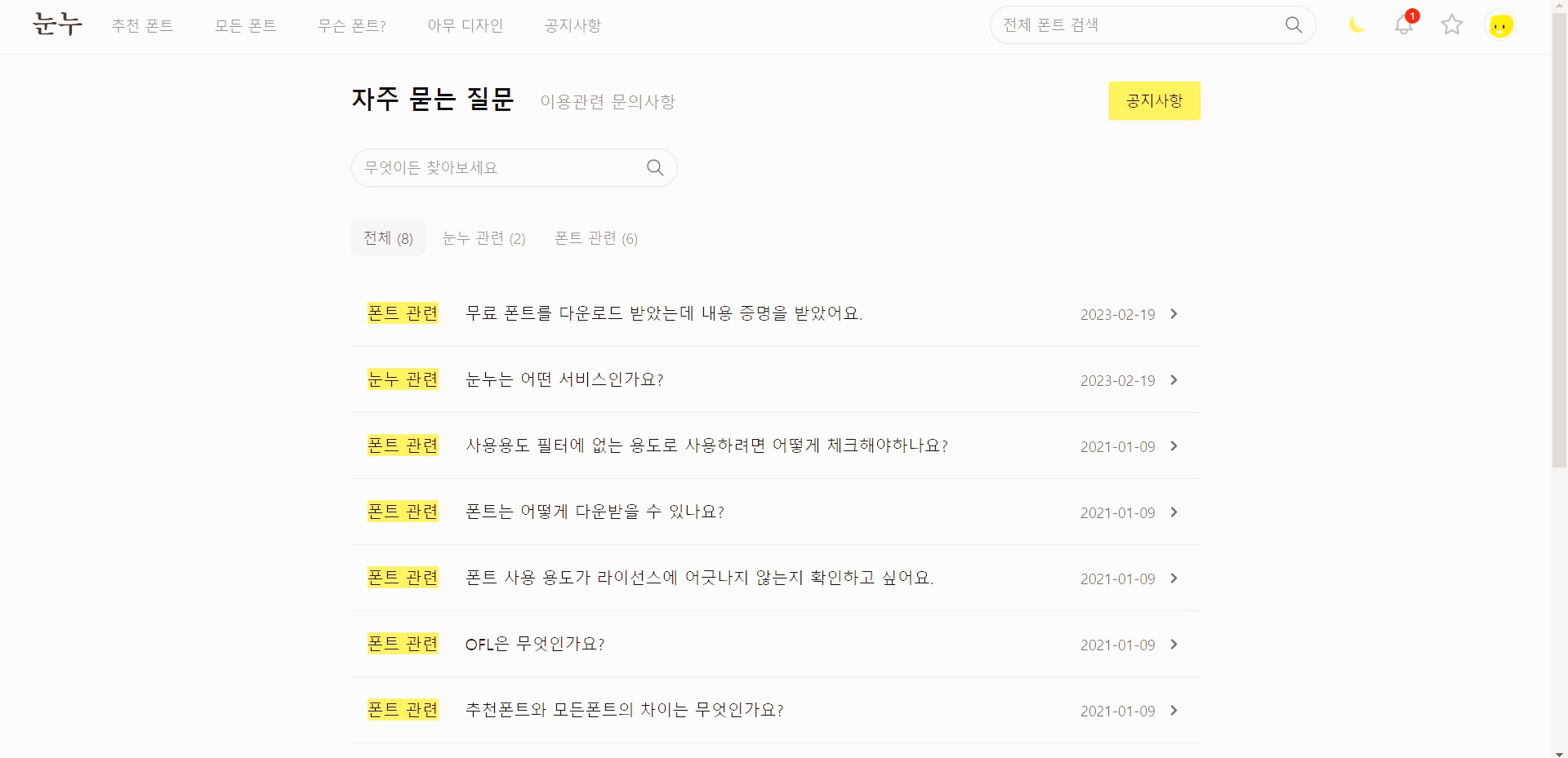 더 이상 무료배포를 하지 않는 디자인 폰트에 대해서는 서체삭제를 하였고, 삭제된 폰트에 대해서는 공지사항에서 확인할 수 있었습니다. 폰트에 관련된 내용들을 확인할 수 있는 '자주 묻는 질문'에서도 필요한 정보를 얻을 수 있습니다.