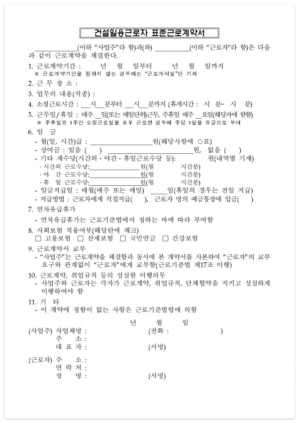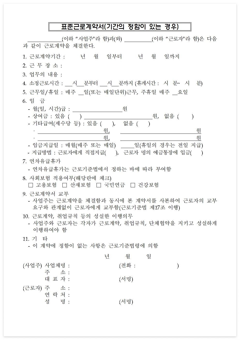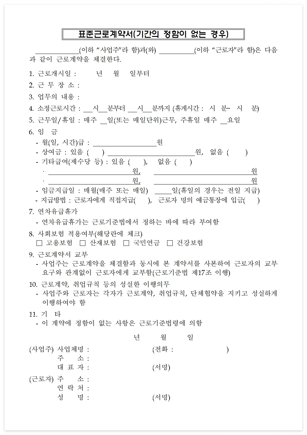근로현장이나 노동현장에서 서면 근로계약 원칙을 확산시키고 정착시키기 위해서 근로계약서를 체결하는 데 있어 근로기준법 제17조에 필수적으로 기재해야 하는 근로조건이 누락되지 않도록 제공되는 양식입니다.