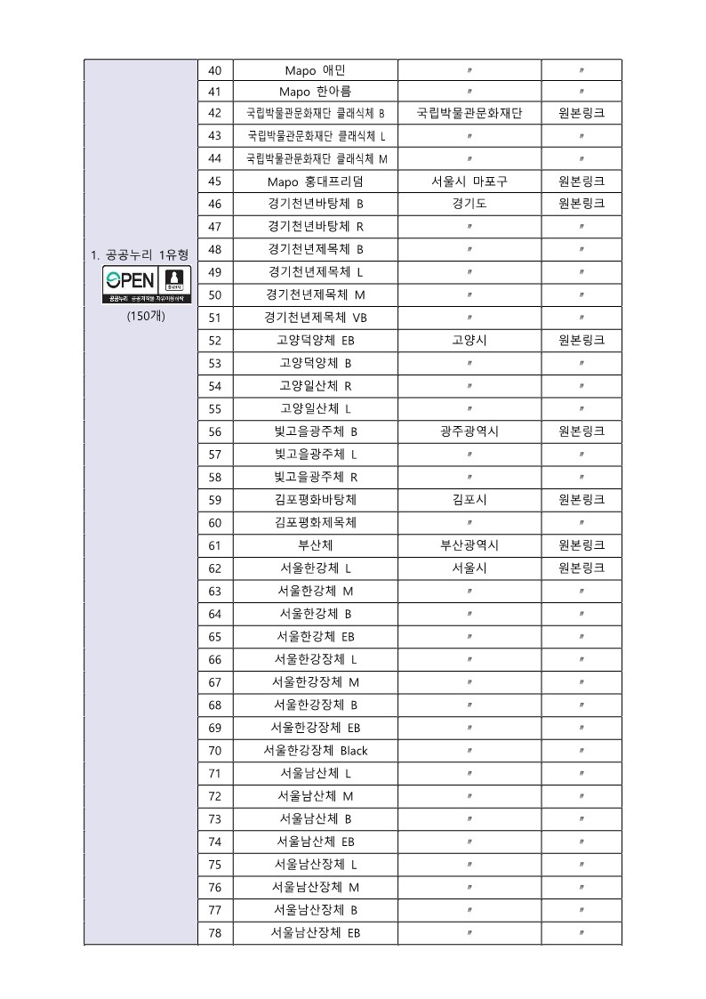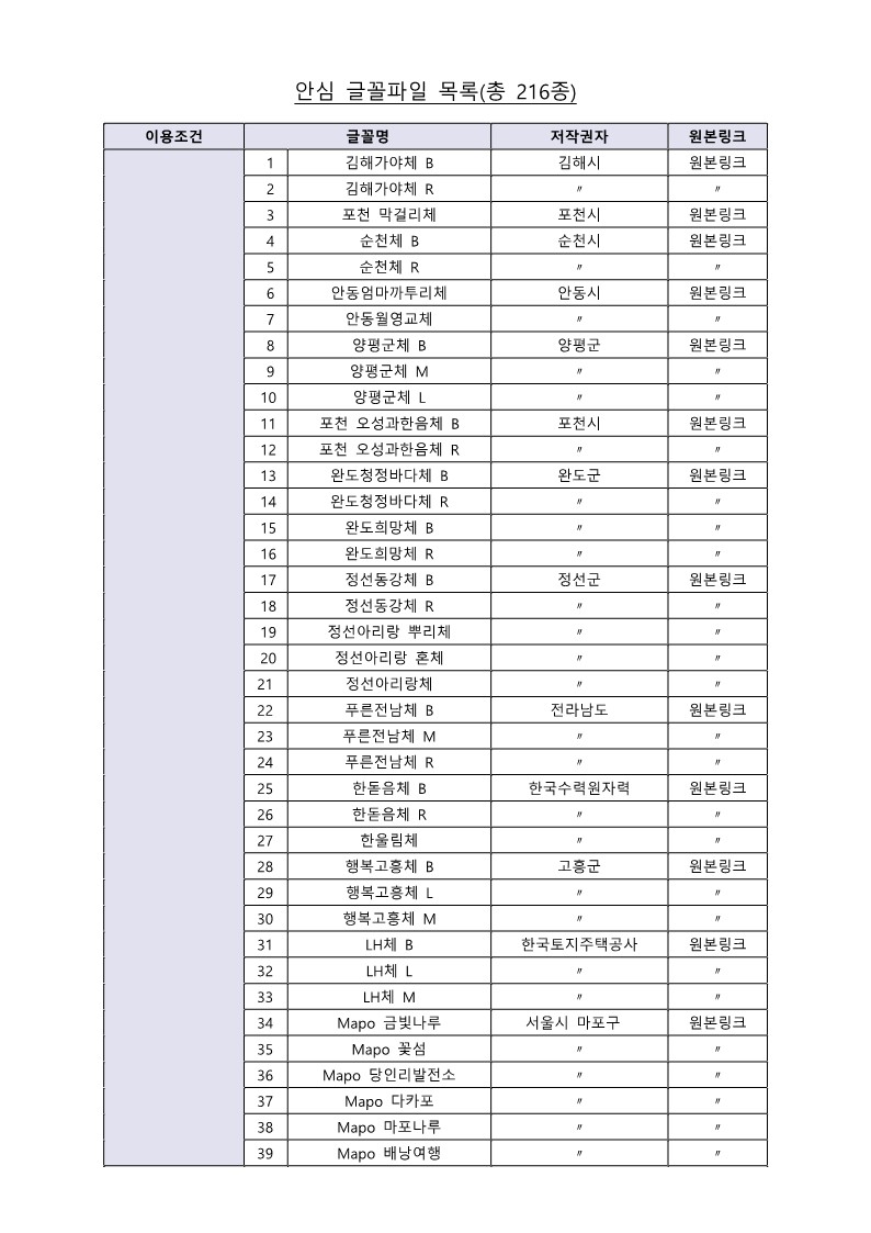 공공누리 안심글꼴파일서비스 제공폰트 목록