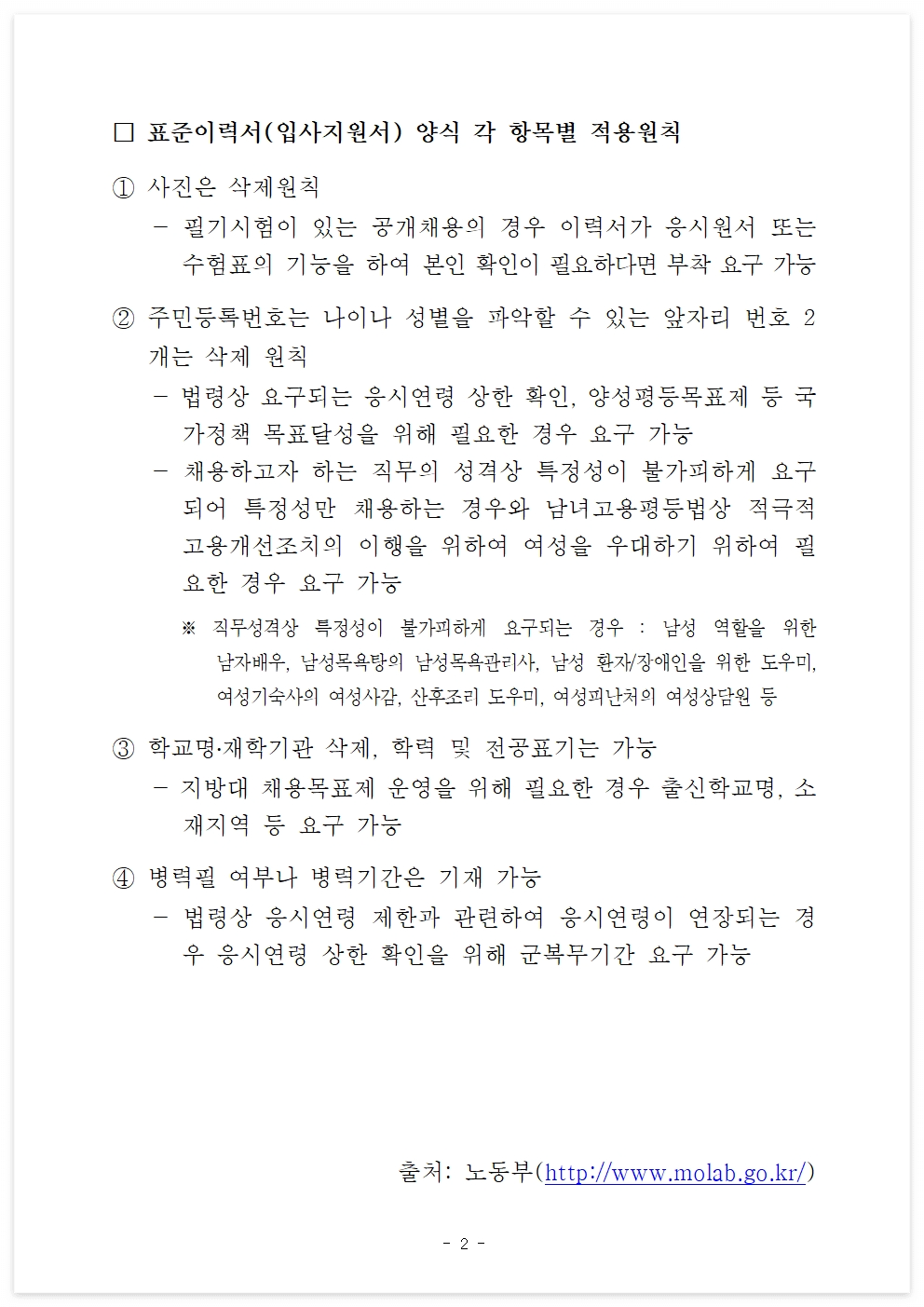 고용노동부에서는 공정화에 관한 법률 제5조에 따라 구인자가 채용에 있어서 기초심사자료로 활용할 수 있도록 양식을 제공합니다. 첨부된 양식은 채용업무에 활용할 수 있도록 파일로 제공하며 상황에 맞게 사용하실 수 있습니다.